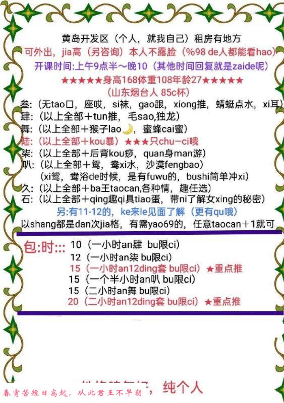 此女在青岛各区市流动服务,自己开车哪都去,城阳,胶州,黄岛,市北,市南,崂山,李村,日照即墨莱西平度